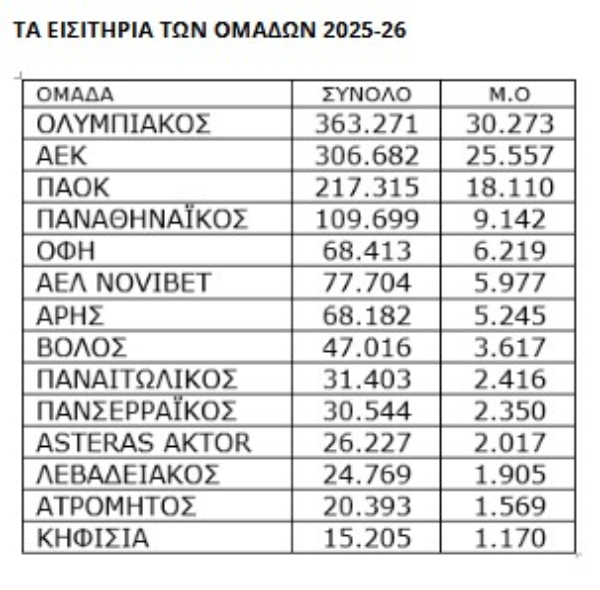 Συνολικά, στις 26 πρώτες αγωνιστικές βρέθηκαν στις εξέδρες 1.406.823 φίλαθλοι, αριθμός που μεταφράζεται σε μέσο όρο 7.993 θεατών ανά παιχνίδι. Πρόκειται για σημαντική αύξηση σε σχέση με την περσινή σεζόν, όπου είχαν καταγραφεί 1.182.478 εισιτήρια και 6.497 θεατές κατά μέσο όρο.