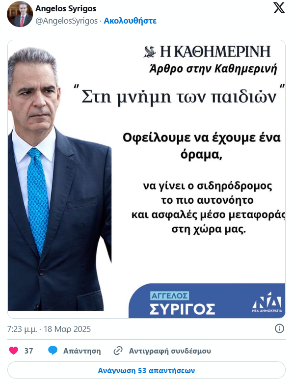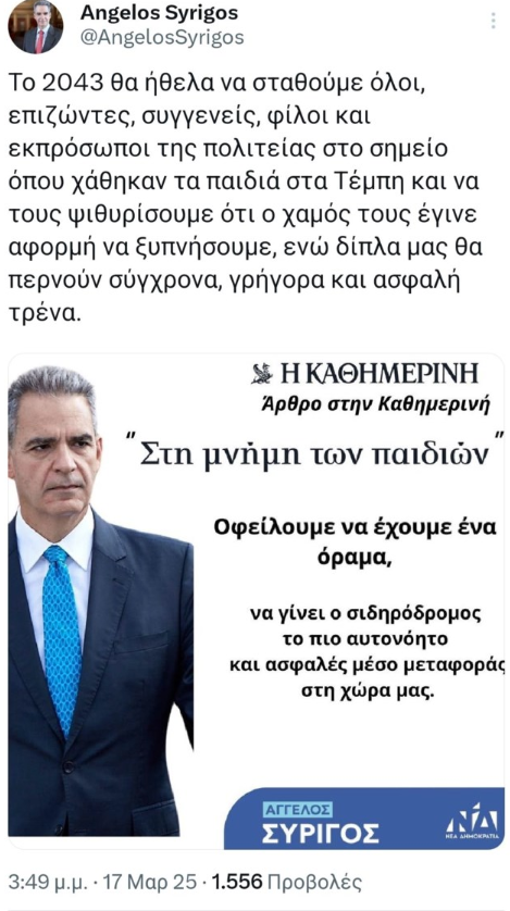 Μετά τη θύελλα αντιδράσεων που προκάλεσε ο καθηγητής Διεθνούς Δικαίου και Εξωτερικής Πολιτικής και βουλευτής της ΝΔ, Αγγελος Συρίγος, διέγραψε την ανάρτησή του για το έγκλημα των Τεμπών όπου ανέφερε: