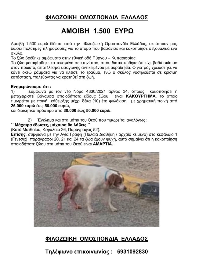 Αποτροπιασμό προκαλεί η άγρια σεξουαλική κακοποίηση σκύλου που αποκαλύφθηκε στο Επιτάλιο Πύργου στην Ηλεία.