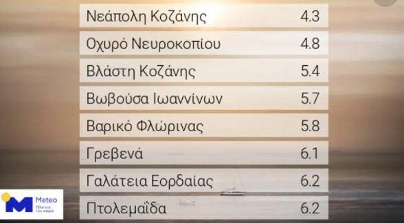 Τοπικά χαμηλές ελάχιστες θερμοκρασίες σημειώθηκαν στα βόρεια τις πρωινές ώρες της Κυριακής 21/09 κυρίως σε τμήματα της Μακεδονίας. Σύμφωνα με το δίκτυο αυτόματων μετεωρολογικών σταθμών του Εθνικού Αστεροσκοπείου Αθηνών / meteo.gr, η χαμηλότερη ελάχιστη θερμοκρασία καταγράφηκε στο μετεωρολογικό σταθμό στη Νεάπολη Κοζάνης με 4.3˚C.