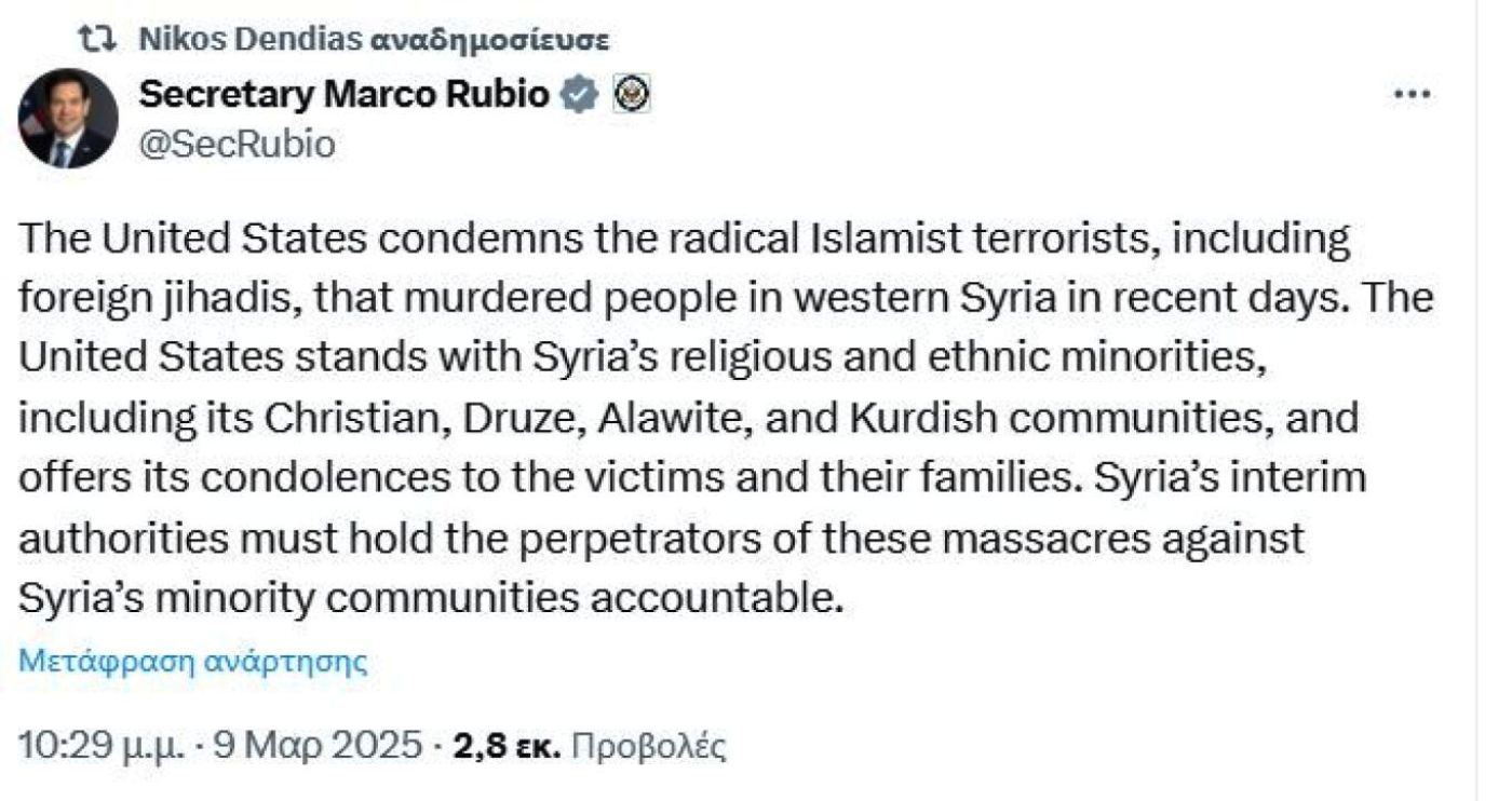 Σε ανάρτηση με νόημα και σε διαφορετικό μήκος κύματος από το ελληνικό υπουργείο εξωτερικών, στην οποία αναδημσιεύει προηγούμενη ανάρτηση του Υπουργού Εξωτερικών των ΗΠΑ, Μάρκο Ρούμπιο προχώρησε ο Έλληνας Υπουργός Εθνικής Άμυνας, Νίκος Δένδιας,  αναφορικά με τις σφαγές αμάχων στην Συρία.