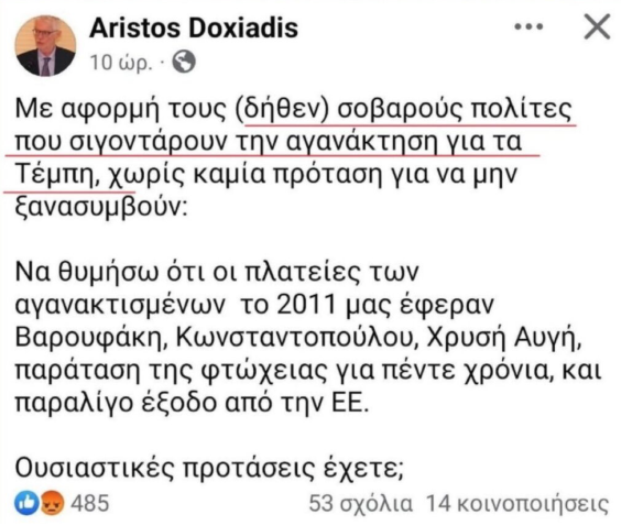 «Με αφορμή τους (δήθεν) σοβαρούς πολίτες που σιγοντάρουν την αγανάκτηση για τα Τέμπη, χωρίς καμία πρόταση για να μην ξανασυμβούν: Να θυμίσω ότι οι πλατείες των αγανακτισμένων το 2011 μας έφεραν Βαρουφάκη, Κωνσταντοπούλου, Χρυσή Αυγή, παράταση της φτώχειας για πέντε χρόνια, και παραλίγο έξοδο από την ΕΕ. Ουσιαστικές προτάσεις έχετε;», έγραφε λίγο πριν τα μεγαλειώδη συλλαλητήρια.