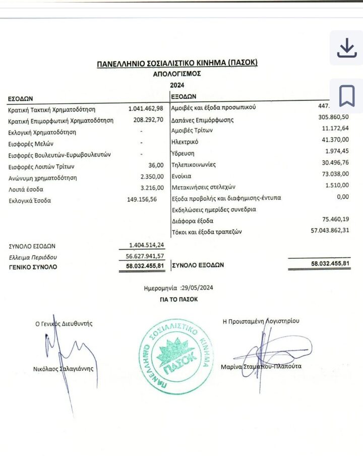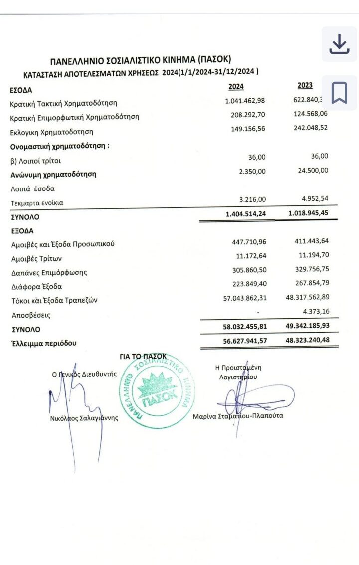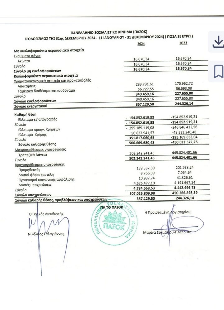 Συγκεκριμένα, οι συνολικές υποχρεώσεις του ΠΑΣΟΚ ανέρχονται πλέον σε 507.026.809,98 €, παρουσιάζοντας αύξηση 56.759.911,14 € μέσα σε έναν χρόνο, αφού το 2023 είχαν καταγραφεί στα 450.266.898,39 €.