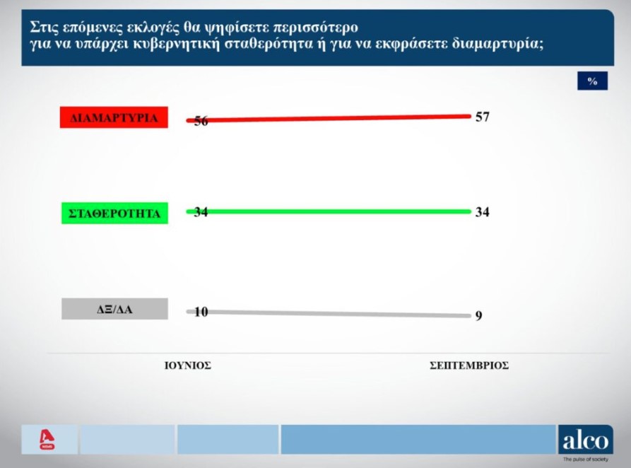 Το 57% δηλώνει πως θα ψηφίσει κυρίως για να διαμαρτυρηθεί, ενώ μόλις το 34% για να διασφαλιστεί κυβερνητική σταθερότητα.