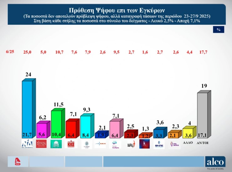 Σε ερώτηση για την πρόθεση ψήφου επί των εγκύρων, η Νέα Δημοκρατία συγκεντρώνει 24% έναντι 11,5% του ΠΑΣΟΚ ενώ η Ελληνική Λύση του Κυριάκου Βελόπουλου που συνεχίζει να παρουσιάζει σημαντική άνοδο, έρχεται τρίτο κόμμα με ποσοστό 9,3.