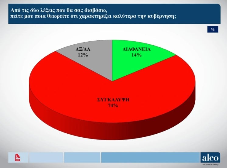 Το αίσθημα ατιμωρησίας κυριαρχεί μεταξύ των πολιτών για την κυβέρνηση, στη δημοσκόπηση της ALCO που παρουσιάστηκε στον Alpha, με τους πολίτες να της καταλογίσουν συγκάλυψη, διαφθορά και αναποτελεσματικότητα.