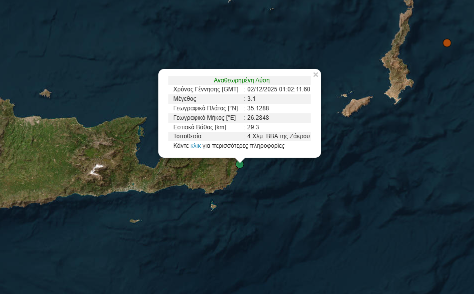 Δύο σεισμοί 3,1 και 3,2 βαθμών της κλίμακας Ρίχτερ σημειώθηκαν τα ξημερώματα της Τρίτης (2/12) στην Κρήτη. Σύμφωνα με το Γεωδυναμικό Ινστιτούτο του Εθνικού Αστεροσκοπείου Αθηνών, ο πρώτος σεισμός, μεγεθους 3,1 Ρίχτερ, σημειώθηκε στις 3:02:11, 4 χιλιόμετρα βόρεια βορειοανατολικά της Ζάκρου.