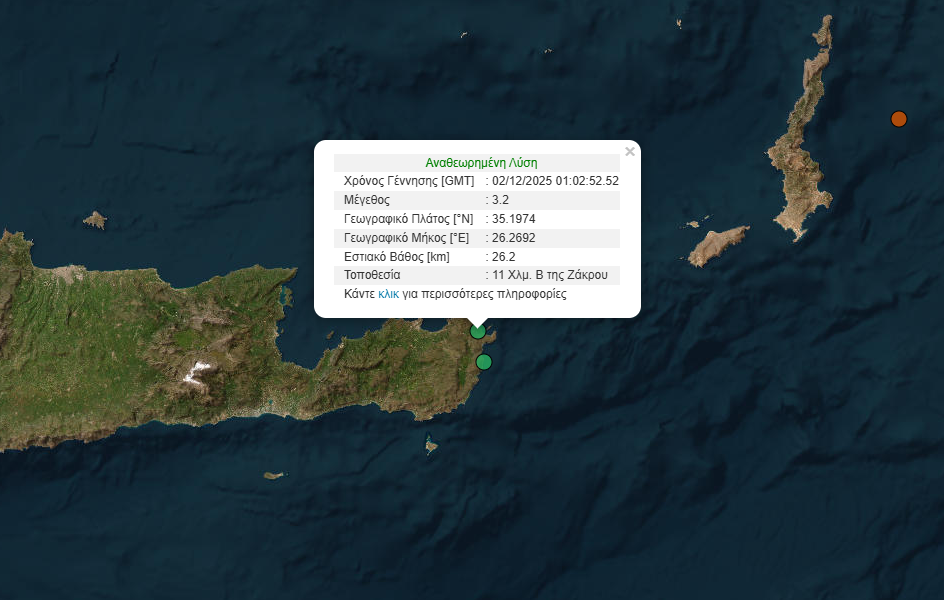 Η δεύτερη σεισμική δόνηση μεγέθους 3,2 Ρίχτερ σημειώθηκε με διαφορά λίγων δευτερολέπτων και συγκεκριμένα, στις 3:02:52, 11 χιλιόμετρα βόρεια της Ζάκρου.