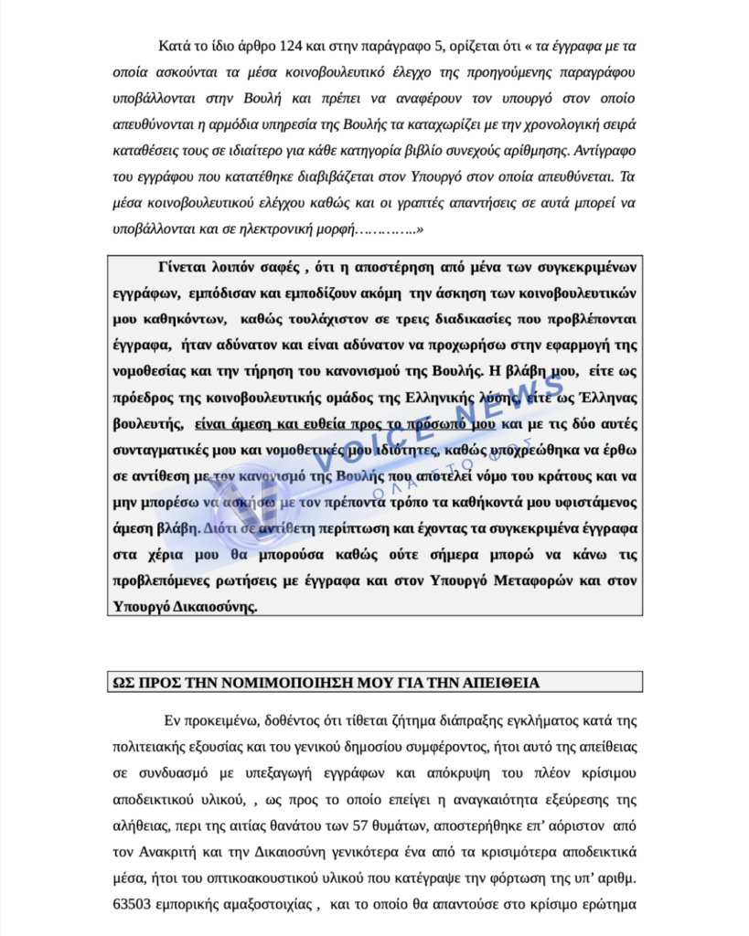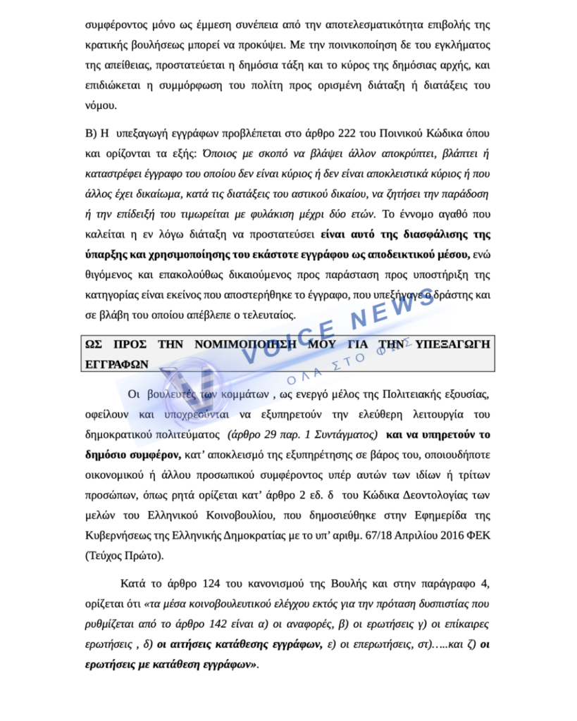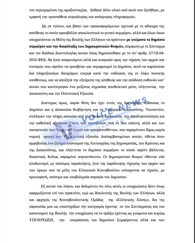 Αγόρευση καταπέλτης του δικηγόρου κ. Βήτα ο οποίος εκπροσωπεί τον Κυριακο Βελόπουλο: Ο πρόεδρος της Ελληνικής Λύσης είναι εδώ ως βουλευτής που εκ του νόμου έχει το δικαίωμα να καταθέτει έγγραφα, αλλά λόγω της υπεξαγωγής εγγράφων (τα βίντεο) από τους κατηγορούμενους δεν μπόρεσε να τελέσει τα καθήκοντα του.
