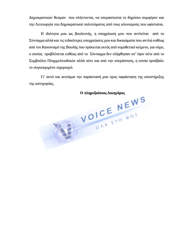 Επίσης, άπαξ και το δημόσιο δεν παρέστη για να καταθέσει παράσταση προς υποστήριξη της κατηγορίας, τότε ο Βελόπουλος ως βουλευτής και εκ του συντάγματος αλλά και προς σεβασμό στον όρκο του ήλθε να υπερασπιστεί το δημόσιο συμφέρον, αφού το ίδιο το δημόσιο δεν παρέστη!