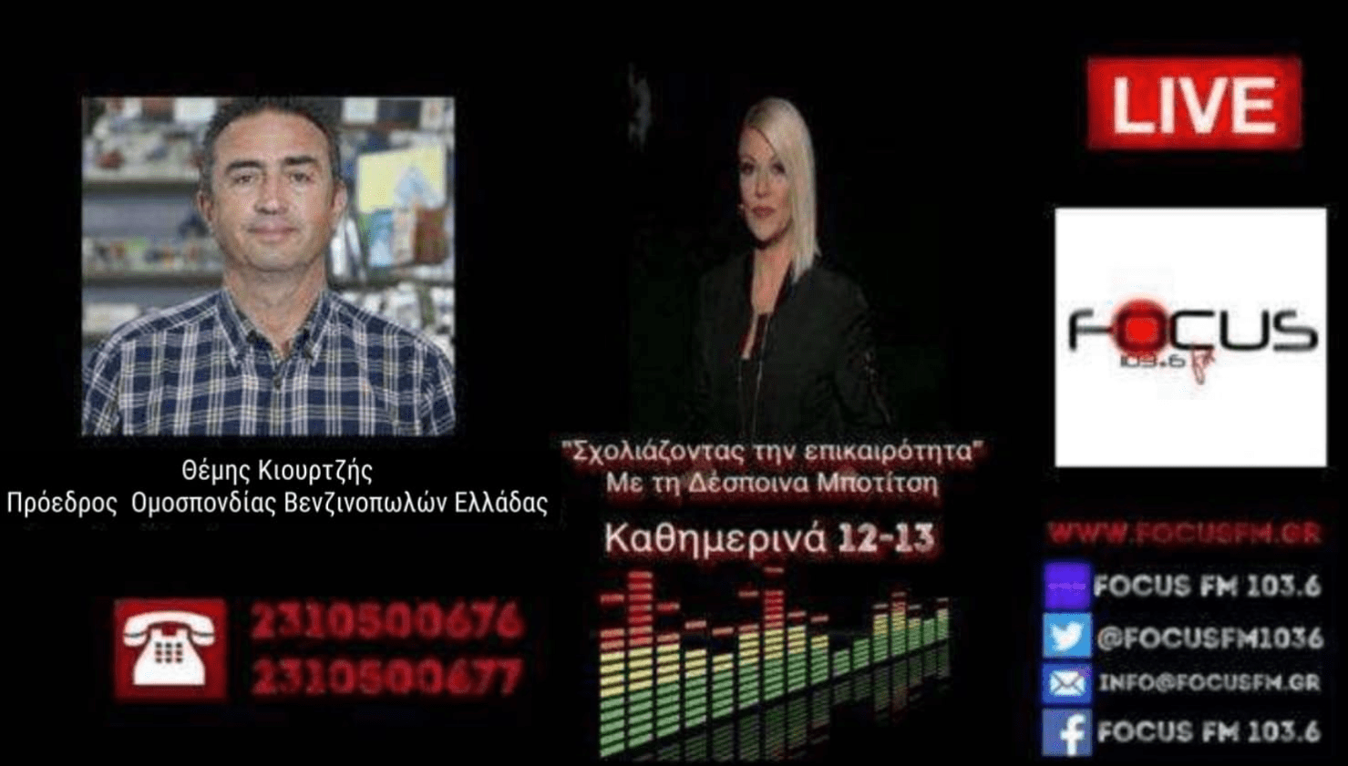 «Έλεος πια, δεν είμαστε τροχαία για να απαγορεύουμε την πώληση καυσίμων στους οδηγούς… σε λίγο θα μας πουν για ζώνη και αλκοτέστ» είπε ο Θέμης Κιουρτζής στον Focus FM 103.6 και στην Δέσποινα Μποτίτση, τονίζοντας την αντίθεση των βενζινοπωλών Θεσσαλονίκης στην εφαρμογή απαγόρευσης πώλησης καυσίμων σε οδηγούς μηχανών που δεν φορούν κράνος.