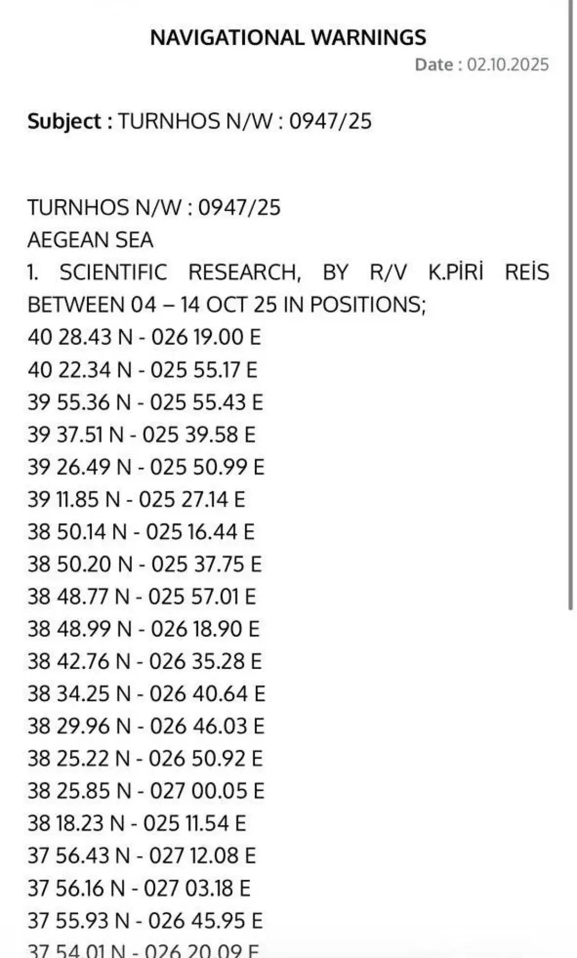 Ελληνική αντι-NAVTEX για την έξοδο του Πίρι Ρέις
