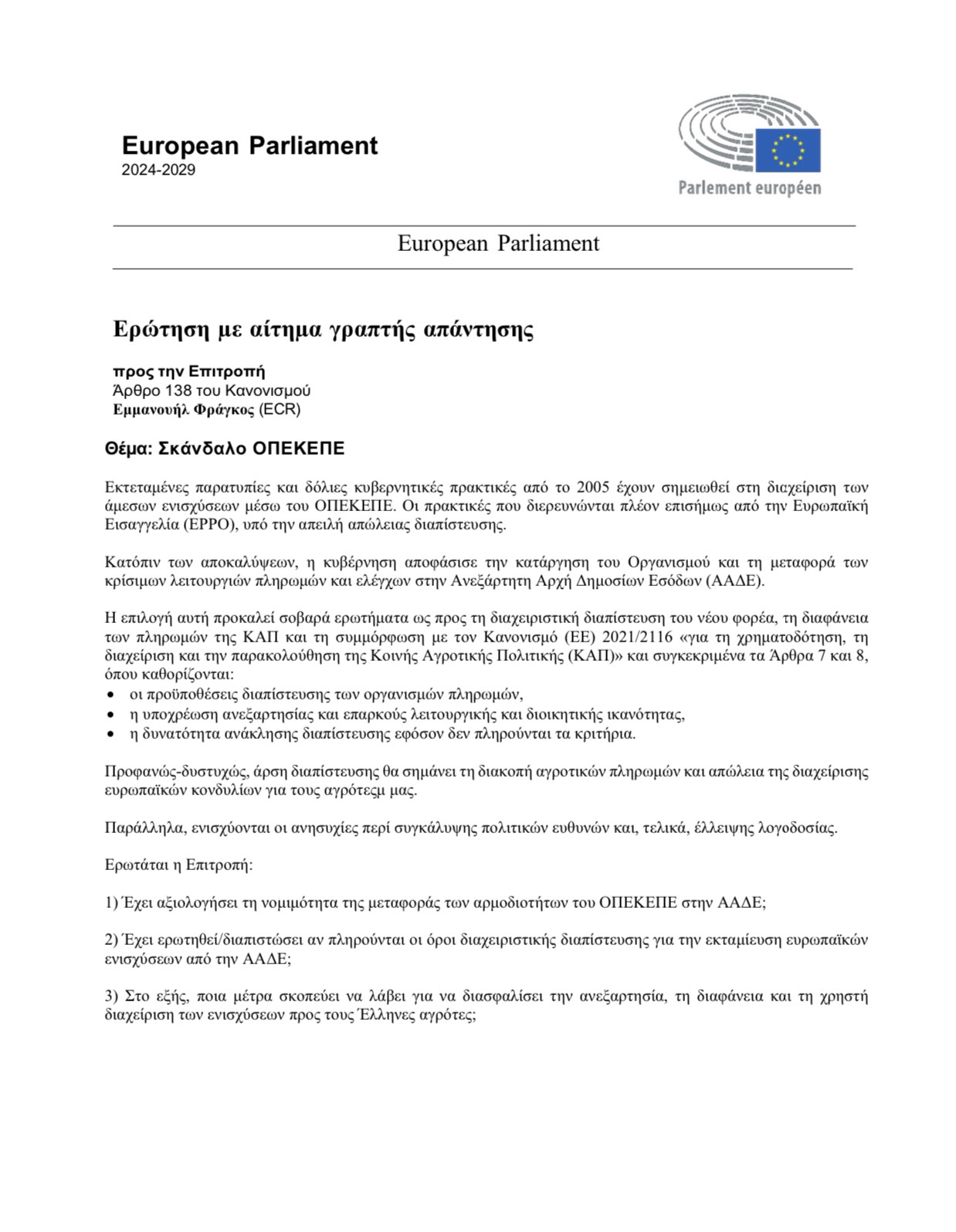 Στην Ευρωβουλή το κυβερνητικό «κουκούλωμα» στο σκάνδαλο του ΟΠΕΚΕΠΕ ύστερα από επίσημη ερώτηση με αίτημα γραπτής απάντησης που κατέθεσε στο Ευρωπαϊκό Κοινοβούλιο ο Ευρωβουλευτής της Ελληνικής Λύσης, Εμμανουήλ Φράγκος.