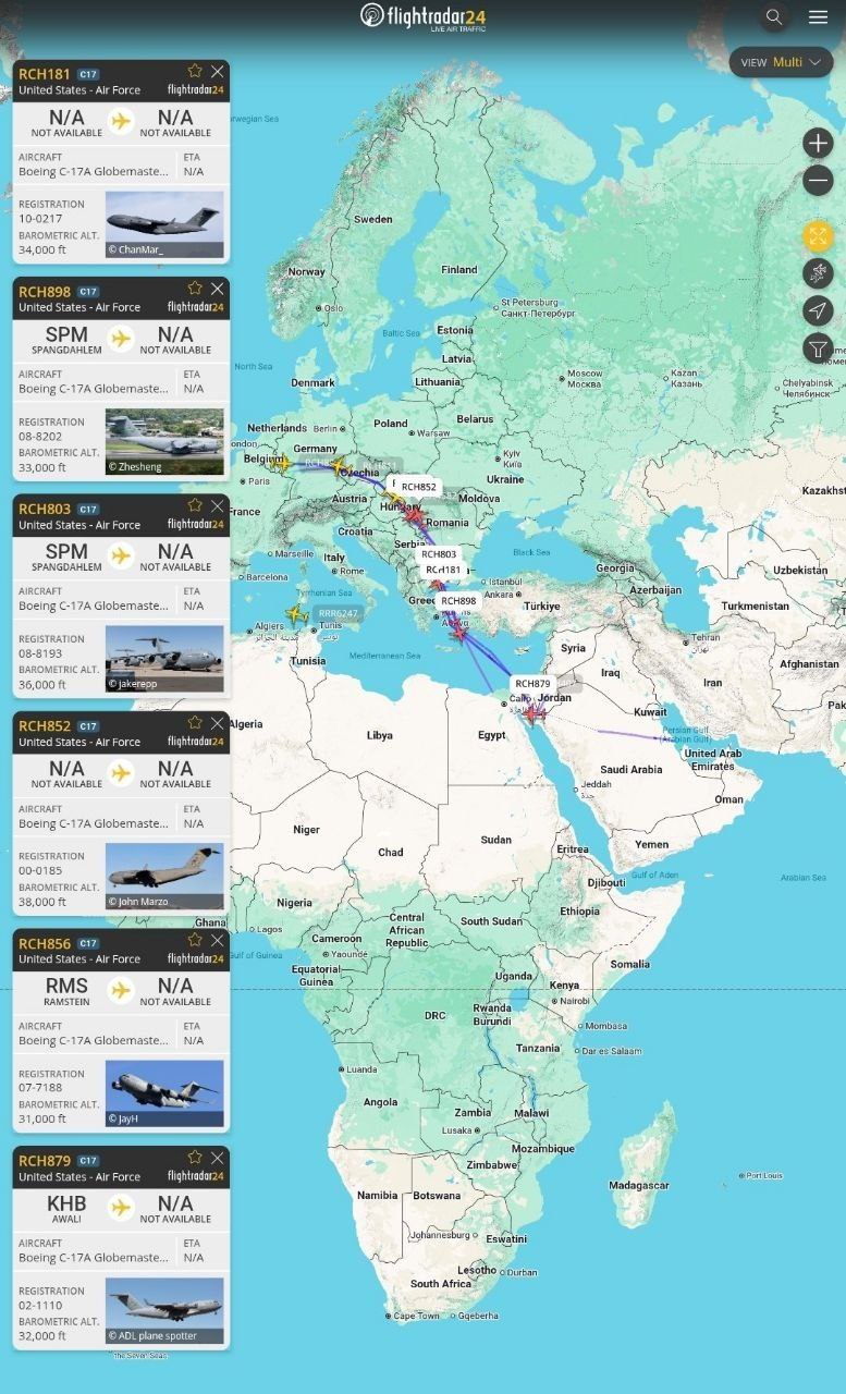 10 αμερικανικά μεταγωγικά αεροσκάφη C-17A έχουν πετάξει τις τελευταίες ώρες μεταξύ αμερικανικών βάσεων στη Γερμανία και αμερικανικών βάσεων στη Μέση Ανατολή – ένας ασυνήθιστα μεγάλος όγκος κινήσεων σε τόσο σύντομο χρονικό διάστημα. Από τις 18 Ιανουαρίου και μέχρι χθες, έχουν καταγραφεί 84 πτήσεις αμερικανικών μεταγωγικών αεροσκαφών αυτού του τύπου στη Μέση Ανατολή, εκτός από 5 πτήσεις των βαρέων και στρατηγικών μεταγωγικών αεροσκαφών C-5M.