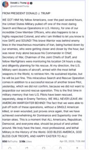 Την είδηση της διάσωσης του Αμερικανού στρατιώτη επιβεβαίωσε με ανάρτησή του στο TruthSocial και ο πρόεδρος των ΗΠΑ, Ντόναλντ Τραμπ.
