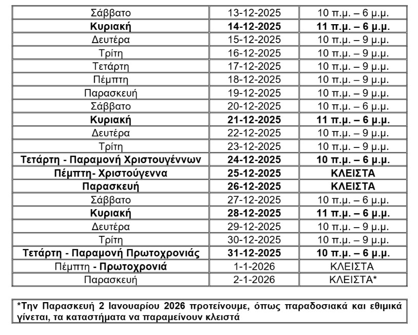 • Παραμονή Πρωτοχρονιάς τα καταστήματα θα είναι ανοιχτά από τις 10:00 έως τις 18:00.