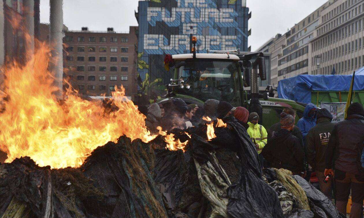 Οι αγρότες επιχείρησαν να βάλουν φωτιά σε λάστιχα από τα αγροτικά τους οχημάτων μερικές εκατοντάδες μέτρα από το κτήριο του Ευρωπαϊκού Συμβουλίου. Η αστυνομία έφερε κανόνια νερού για να αποφευχθεί η εξάπλωση της πυρκαγιάς.