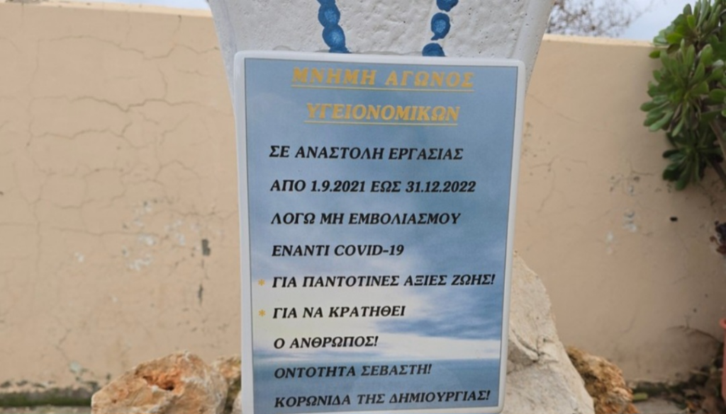 Όπως βλέπετε, στη σχετική ταμπέλα που το συνοδεύει, αναγράφεται: «Μνήμη αγώνος υγειονομικών. Από 1.9.2021 έως 31.12.2022 λόγω μη εμβολιασμού έναντι covid -19. Για παντοτινές αξίες ζωής. Για να κρατηθεί ο άνθρωπος! Οντότητα σεβαστή! Κορωνίδα της δημιουργίας!»