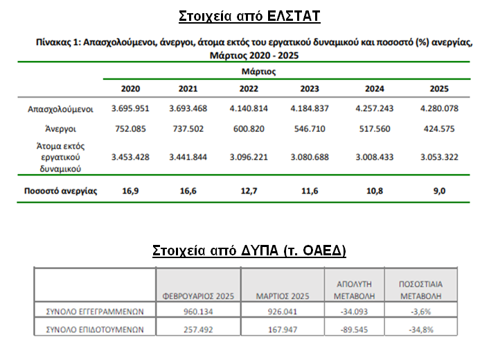 Η Ελληνική Στατιστική Υπηρεσία (ΕΛΣΤΑΤ) ανακοίνωσε χθες 424.575 (ποσοστό 9%) για τον Μάρτιο 2025, δηλαδή αυξημένη ανεργία κατά 20.940 ανθρώπους (ποσοστό +0,4%) σε σχέση με τον Φεβρουάριο 2025 που ήταν 8,6%!!