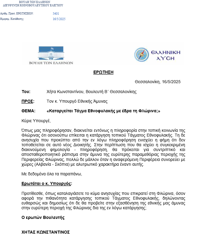 Το θέμα έφερε στη Βουλή με ερώτηση ο βουλευτής της Ελληνικής Λύσης Χήτας Κωνσταντίνος, ζητώντας ξεκάθαρες απαντήσεις από τον Υπουργό Εθνικής Άμυνας.