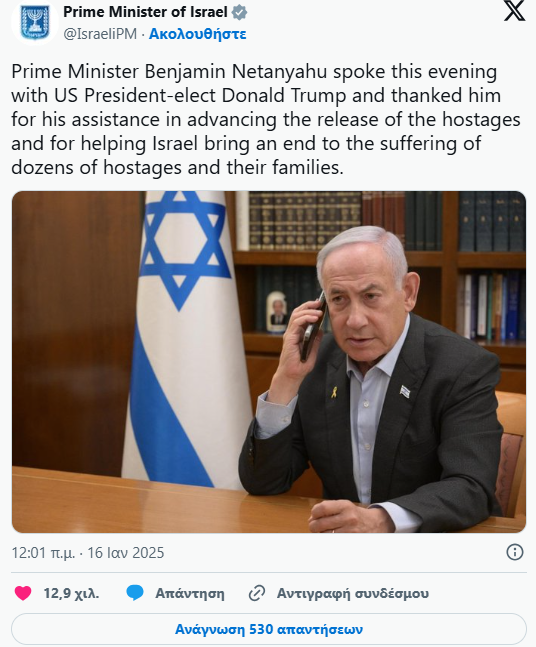 Ο Νετανιάχου ευχαριστεί τους Τραμπ και Μπάιντεν για τη βοήθειά τους – Ετοιμάζεται να υποδεχθεί τους ομήρους το Ισραήλ