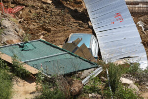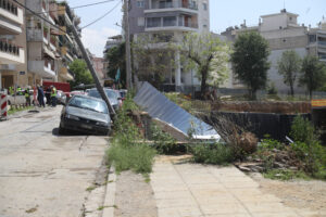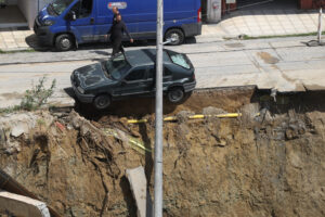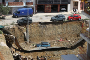 Λόγω της υποχώρησης του οδοστρώματος, τα παρκαρισμένα οχήματα στην άκρη της οδού Αλοννήσου κρέμονται στον αέρα ενώ ένα έπεσε μέσα στο εργοτάξιο!
