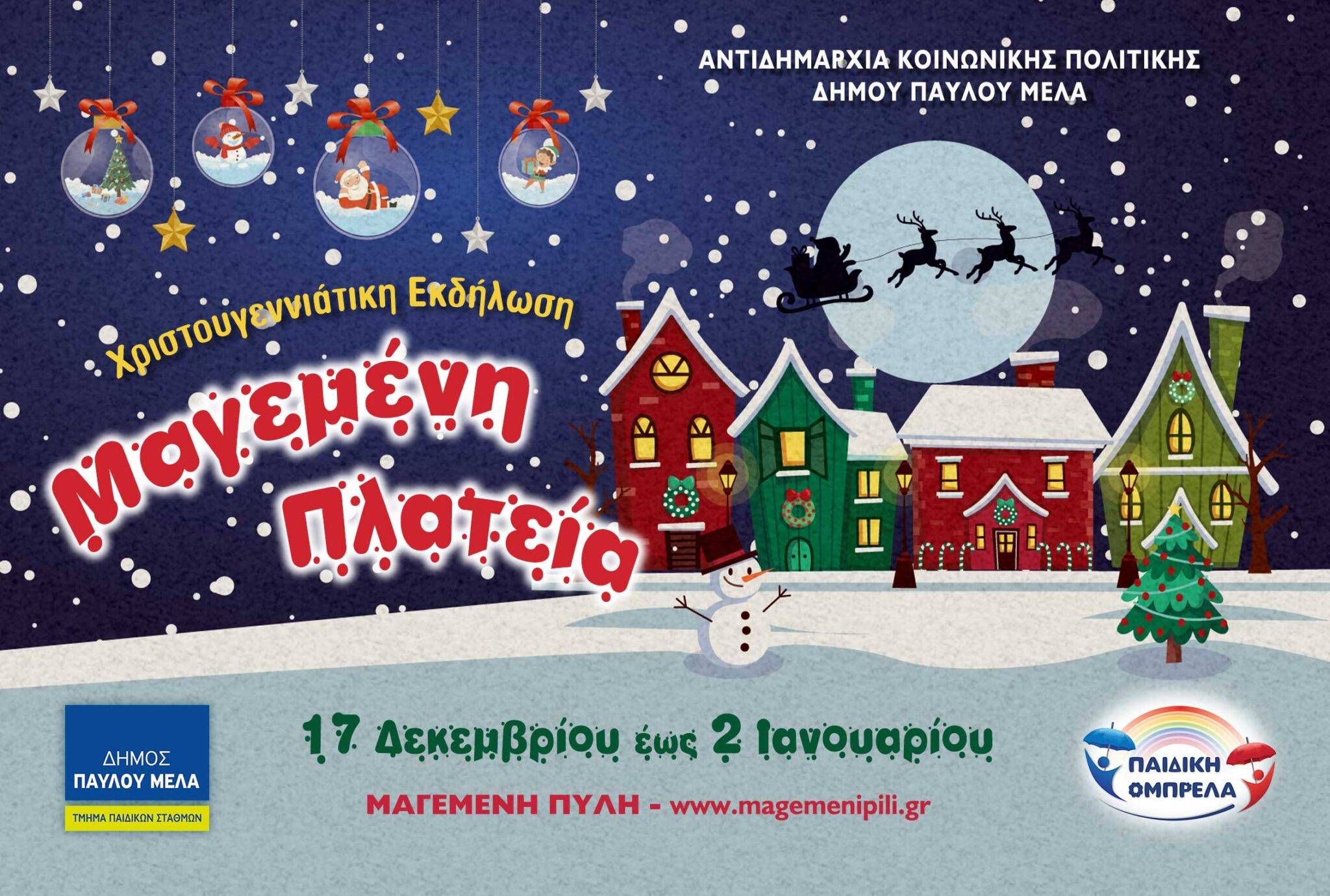 Η Αντιδημαρχία Κοινωνικής Πολιτικής εδώ και χρόνια αποδεικνύει ότι αφουγκράζεται τις ανάγκες όλων των κοινωνικών ομάδων της πόλης μας και κυρίως των μικρών παιδιών. Ακόμα και στα δύσκολα χρόνια της πανδημίας καταφέραμε και μεταδώσαμε το χριστουγεννιάτικο κλίμα σε χιλιάδες σπίτια μέσω του διαδικτύου. Αυτά τα Χριστούγεννα όμως, δίνουμε ενωμένοι όλες μας τις δυνάμεις για να μπορέσουμε να ξαναζήσουμε τη μαγεία των Χριστουγέννων και δια ζώσης. Μέσα από δράσεις, παραμύθια, συνεργασίες, παιχνίδια και πανέμορφο χριστουγεννιάτικο διάκοσμο, η Μαγεμένη μας Πλατεία σας καλωσορίζει στα Χριστούγεννα της ελπίδας. Με αγάπη, άφθονη χριστουγεννιάτικη μαγεία και πασπαλίζοντας λίγη λαμπερή χρυσόσκονη σας καλωσορίζουμε σε ένα κόσμο που οι ιστορίες του Άη Βασίλη μαλακώνουν τις καρδιές και διαδίδουν το μήνυμα της χαράς και της αισιοδοξίας.