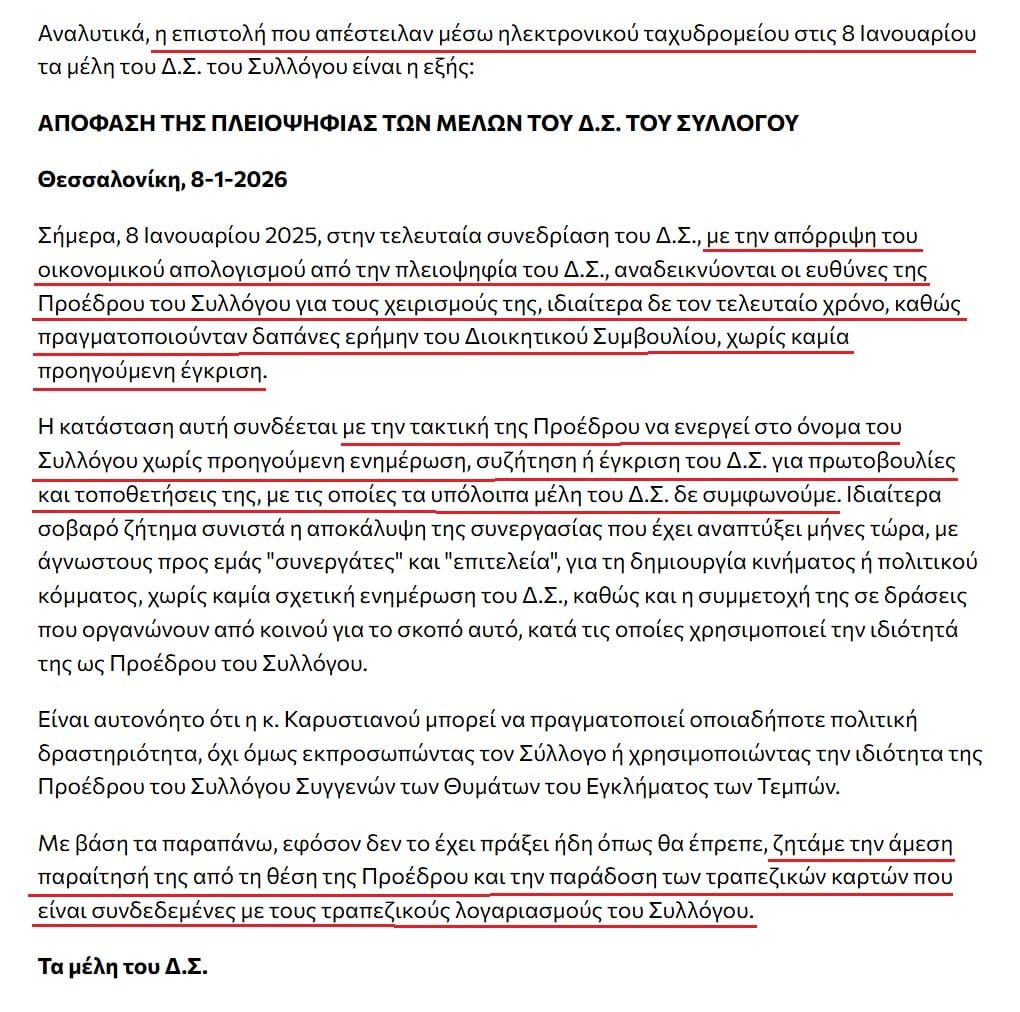 Τα πέντε μέλη του διοικητικού συμβουλίου του Συλλόγου σε ανακοίνωση τους ανέφεραν ότι με επιστολή που της απέστειλαν στο προσωπικό της email στις 8 Ιανουαρίου 2026, της απηύθυναν δύο σαφή αιτήματα: αφενός να παραιτηθεί από την προεδρία του Συλλόγου και αφετέρου να παραδώσει στο Διοικητικό Συμβούλιο τις τραπεζικές κάρτες των λογαριασμών του Συλλόγου, οι οποίες ήταν στο όνομά της.