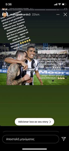 “Αδερφέ, σε ευχαριστώ πολύ για τα καλά σου λόγια. Ήταν χαρά και προνόμιο να είμαστε μαζί τα τελευταία χρόνια. Πόσες στιγμές και αγώνες κερδίσαμε μαζί! Αυτό που μένει είναι η φιλία και η εκτίμηση… Τώρα πήγαινε σε άλλον να σου πλένει το αυτοκίνητο… Μάτος out”, έγραψε χαρακτηριστικά ο Λέο Μάτος για τον Πορτογάλο.