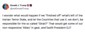 «Αναρωτιέμαι τι θα συνέβαινε αν “τελειώναμε” με ό,τι έχει απομείνει από το ιρανικό τρομοκρατικό κράτος και αφήναμε τις χώρες που το χρησιμοποιούν -όχι εμείς- να είναι υπεύθυνες για το λεγόμενο “Στενό”; Αυτό θα έκανε ορισμένους από τους «συμμάχους» που δεν ανταποκρίνονται, να κινητοποιηθούν, και γρήγορα!!!» έγραψε ο Ντόναλντ Τραμπ στο δίκτυό του μέσο κοινωνικής δικτύωσης το Truth Social.