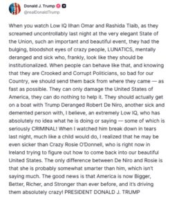 Σε ανάρτησή του, ο πρόεδρος αποκάλεσε τις δύο βουλευτές «χαμηλού IQ» και υποστήριξε ότι «θα έπρεπε να εγκλειστούν σε ίδρυμα», περιγράφοντάς τες ως «τρελές, διαταραγμένες και άρρωστες».