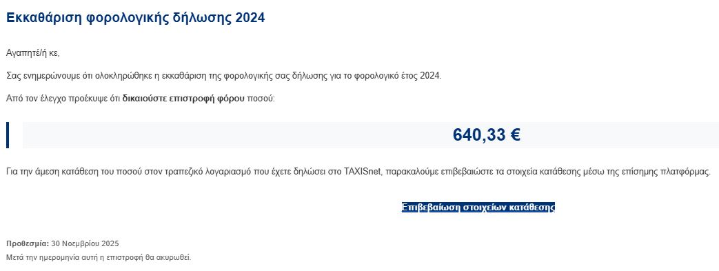 Σύμφωνα με το gegonota.news, φορολογούμενος στον Βόλο έλαβε ένα από τα μηνύματα αυτά, στο οποίο αναφέρεται ότι ολοκληρώθηκε η εκκαθάριση της φορολογικής του δήλωσης για το φορολογικό έτος 2024 και από τον έλεγχο προέκυψε ότι δικαιούται δήθεν επιστροφή φόρου ποσού 640,33 €. Ο αποστολέας καλεί τον παραλήπτη του μηνύματος να επιβεβαιώσει τα στοιχεία του μέσω ηλεκτρονικού συνδέσμου ο οποίος, όμως, οδηγεί σε παραπλανητική και πλαστή ιστοσελίδα. Σκοπός είναι η υποκλοπή προσωπικών και τραπεζικών δεδομένων των πολιτών. Μάλιστα στο μήνυμα αναγράφεται ότι η επιβεβαίωση των στοιχείων κατάθεσης θα πρέπει να γίνει μέχρι τις 30 Νοεμβρίου 2025 και μετά την ημερομηνία αυτή η επιστροφή θα ακυρωθεί.