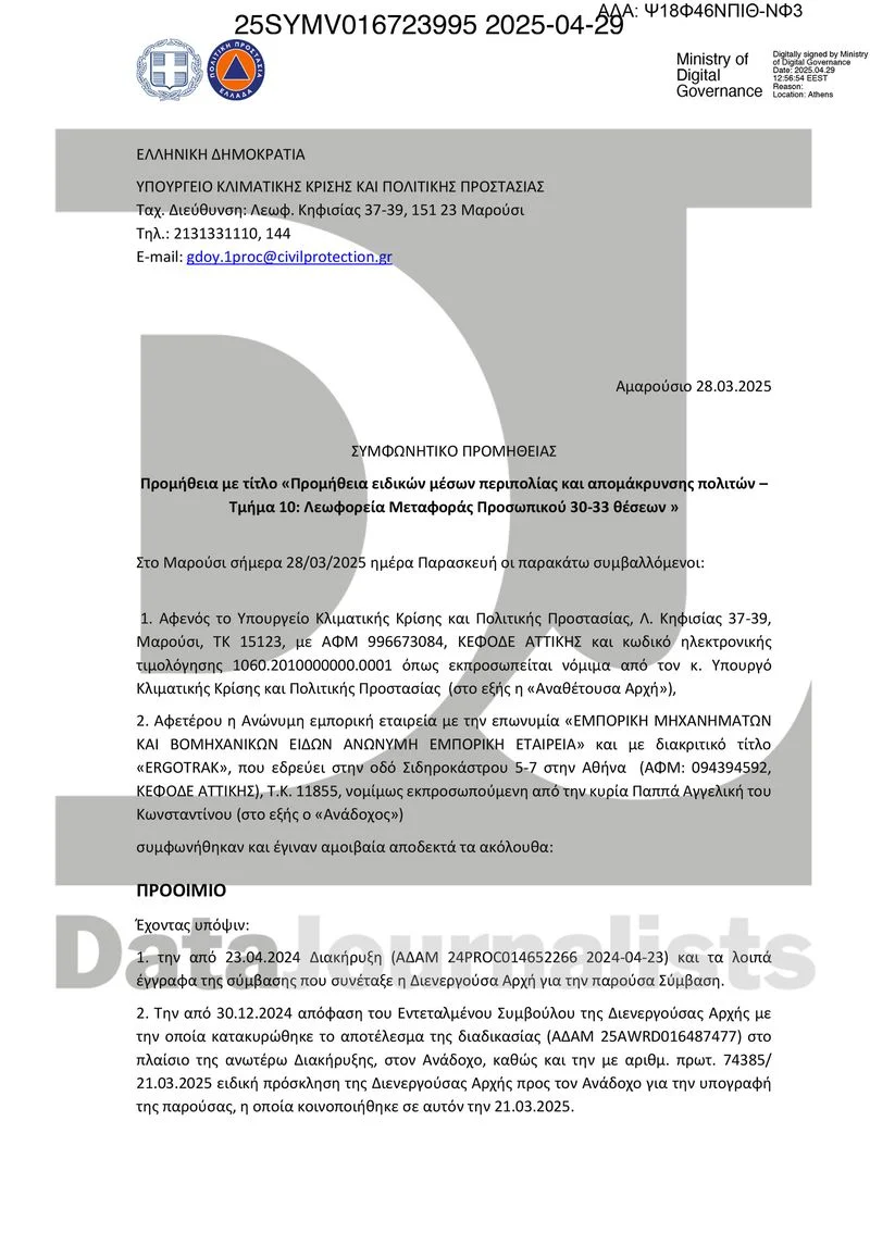 Η σύμβαση, σύμφωνα με αποκαλυπτικό ρεπορτάζ του Βασίλη Γαλούπη για τους Data Journalists, υπογράφηκε στις 28 Μαρτίου 2025 μεταξύ του υπουργείου και της εταιρείας «Ergotrak», θυγατρικής του Ομίλου Σφακιανάκη. Αντικείμενο: η προμήθεια δύο λεωφορείων τύπου Navigo T, που κατασκευάζονται από την τουρκική βιομηχανία Otokar, εταιρεία του ομίλου Koç Holding, ενός από τους ισχυρότερους επιχειρηματικούς πυλώνες της γείτονος, με ιστορικούς δεσμούς με το τουρκικό κράτος και τις ένοπλες δυνάμεις.