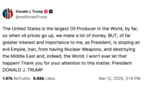 «Οι ΗΠΑ είναι μακράν ο μεγαλύτερος παραγωγός πετρελαίου στον κόσμο, επομένως όταν οι τιμές του πετρελαίου αυξάνονται, βγάζουμε πολλά χρήματα. ΑΛΛΑ, ως Πρόεδρος, αυτό που είναι πολύ πιο σημαντικό για μένα είναι να εμποδίσουμε μια αυτοκρατορία του κακού, το Ιράν, από το να αποκτήσει πυρηνικά όπλα και να καταστρέψει τη Μέση Ανατολή, και ίσως ακόμη και ολόκληρο τον κόσμο», αναφέρει χαρακτηριστικά ο Αμερικανός πρόεδρος σε ανάρτησή του στο Truth Social.