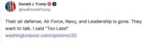 «Η αεροπορική τους άμυνα, η Πολεμική Αεροπορία, το Πολεμικό Ναυτικό και η Ηγεσία τους, τελείωσαν. Θέλουν να μιλήσουν. Είπα “Πολύ αργά!”» έγραψε ο Τραμπ σε ανάρτηση του στο Truth Social.