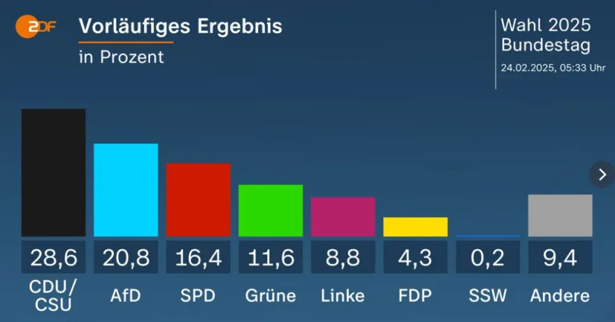 Η Χριστιανική Ένωση (CDU/CSU) η νικήτρια των πρόωρων βουλευτικών εκλογών στη Γερμανία με 28,6% χωρίς όμως τη δυνατότητα αυτοδύναμης κυβέρνησης.