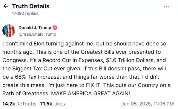 «Δεν με πειράζει που ο Έλον στράφηκε εναντίον μου, αλλά θα έπρεπε να το είχε κάνει μήνες πριν. Αυτό είναι ένα από τα σπουδαιότερα νομοσχέδια που έχουν παρουσιαστεί ποτέ στο Κογκρέσο. Πρόκειται για μια μείωση ρεκόρ στα έξοδα, 1,6 τρισεκατομμύρια δολάρια, και η μεγαλύτερη μείωση φόρων που έχει δοθεί ποτέ. Εάν αυτό το νομοσχέδιο δεν περάσει, θα υπάρξει αύξηση φόρων κατά 68%, και πράγματα πολύ χειρότερα από αυτό. Δεν δημιούργησα εγώ αυτό το χάος, είμαι απλώς εδώ για να ΤΟ ΔΙΟΡΘΩΣΩ. Αυτό βάζει τη χώρα μας σε μια πορεία μεγαλείου. ΚΑΝΤΕ ΤΗΝ ΑΜΕΡΙΚΗ ΞΑΝΑ ΜΕΓΑΛΗ!»