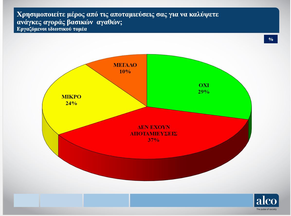 7 στους 10 «βάζουν χέρι» στις αποταμιεύσεις ή δεν έχουν καθόλου Για έξι στους δέκα μισθωτούς του ιδιωτικού τομέα, τα χρήματα τελειώνουν πριν βγει ο μήνας, επιβεβαιώνει νέα έρευνα της Αlco για τη ΓΣΕΕ. Το 88% κόβει κι απ’ τα τρόφιμα.