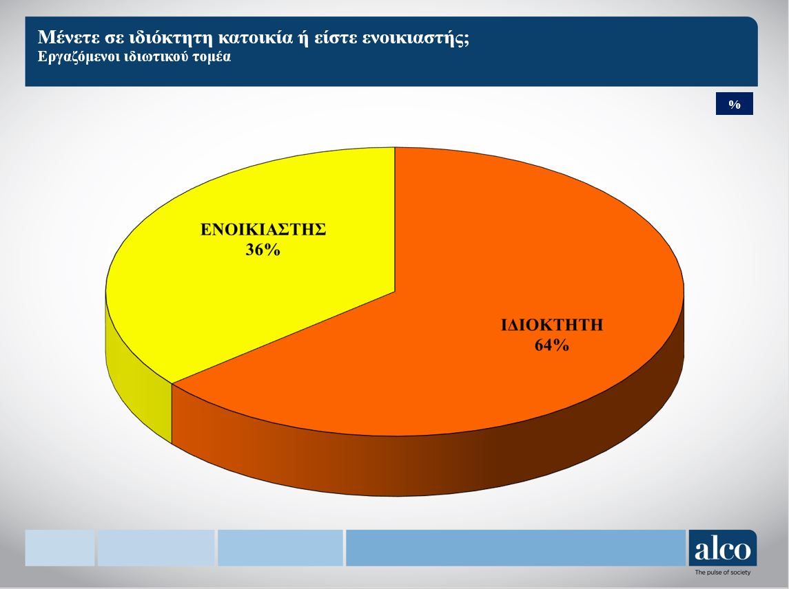 Ένα εξαιρετικά ενδιαφέρον εύρημα είναι ότι σχεδόν οι τέσσερις στους δέκα εργαζόμενους του ιδιωτικού τομέα (36%) είναι ενοικιαστές. Το 64% διαμένει σε ιδιόκτητη κατοικία.