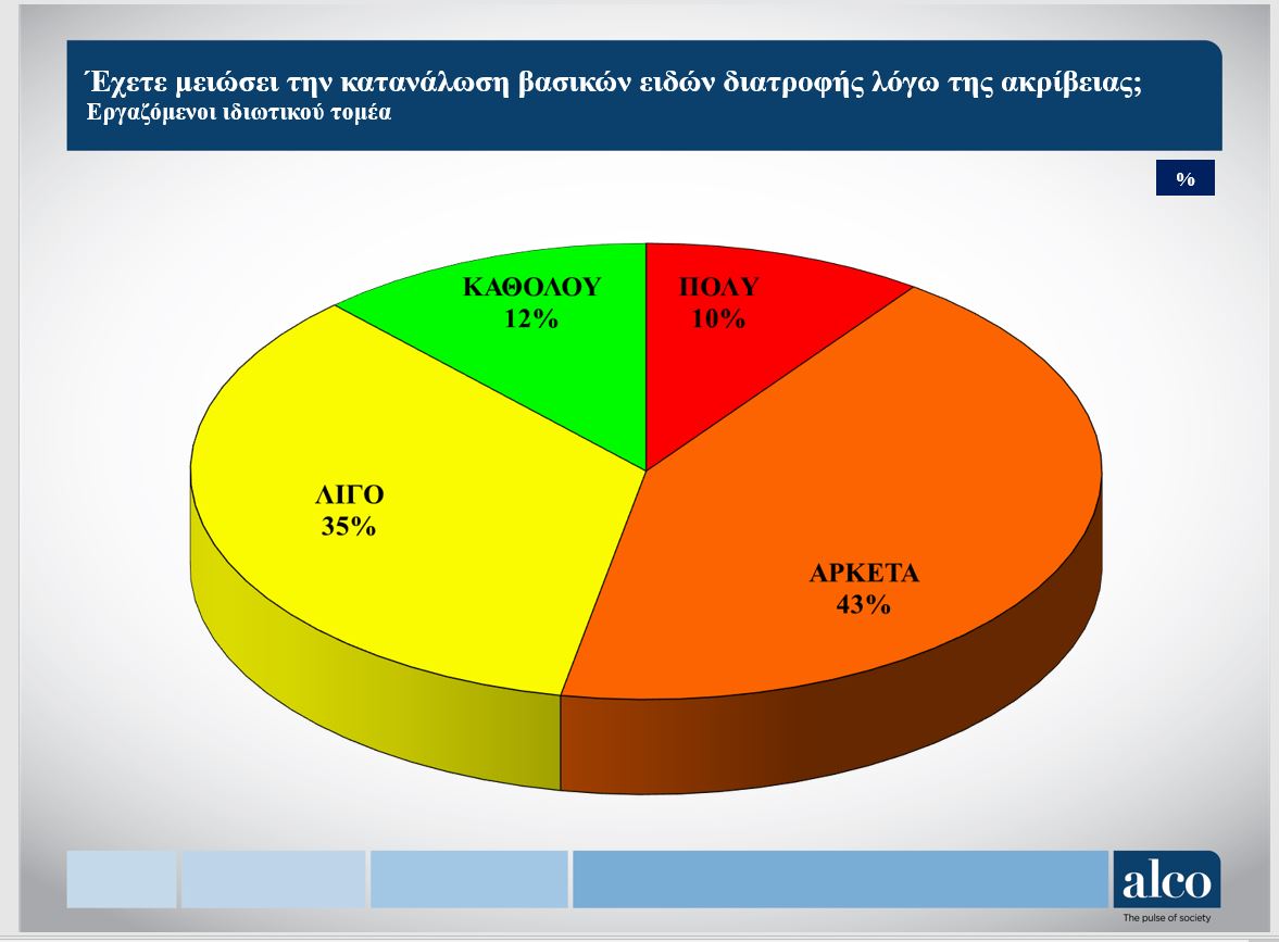Επίσης η συντριπτική πλειονότητα των μισθωτών έχουν περιορίσει μέχρι και την κατανάλωση βασικών ειδών διατροφής λόγω της ακρίβειας Πάνω από τους μισούς (53%) έχουν μειώσει αρκετά ως πολύ την κατανάλωση βασικών τροφίμων, το 35% την έχει μειώσει λίγο, και μόλις ένα 12% έχει μείνει ανέγγιχτο από την ακρίβεια στα τρόφιμα.