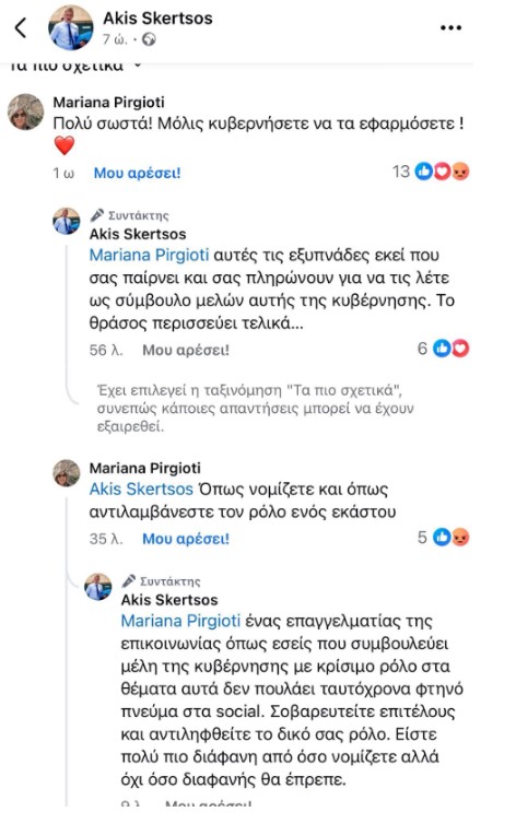Ο Σκέρτσος όμως συνέχισε: «Ένας επαγγελματίας της επικοινωνίας όπως εσείς που συμβουλεύει μέλη της κυβέρνησης με κρίσιμο ρόλο, δεν πουλάει ταυτόχρονα φθηνό πνεύμα στα social. Σοβαρευτείτε επιτέλους και αντιληφθείτε το δικό σας ρόλο. Είστε πολύ πιο διάφανη απ’ όσο νομίζετε αλλά όχι όσο διαφανής θα έπρεπε» έγραψε ο υπουργός Επικρατείας.