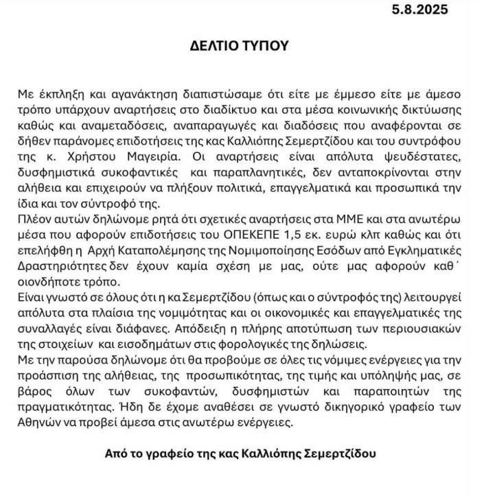 Με δελτίο τύπου που εξέδωσε η ίδια, διαψεύδει ότι ο σύντροφός της βρίσκεται υπό έρευνα από την Ευρωπαϊκή Εισαγγελία και την Ανεξάρτητη Αρχή Καταπολέμησης της Νομιμοποίησης Εσόδων από Εγκληματικές Δραστηριότητες, σε σχέση με την υπόθεση του ΟΠΕΚΕΠΕ.
