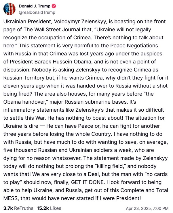 «Ο Πρόεδρος της Ουκρανίας, Βολοντίμιρ Ζελένσκι, κομπάζει στο πρωτοσέλιδο της Wall Street Journal δηλώνοντας ότι «Η Ουκρανία δεν θα αναγνωρίσει νομικά την κατοχή της Κριμαίας. Δεν υπάρχει τίποτε για να συζητήσουμε εδώ». Αυτή η δήλωση είναι εξαιρετικά επιζήμια για τις ειρηνευτικές διαπραγματεύσεις με την Ρωσία, καθώς η Κριμαία χάθηκε πριν από χρόνια υπό την εποπτεία του Προέδρου Μπαράκ Χουσεΐν Ομπάμα και δεν αποτελεί καν αντικείμενο συζήτησης.