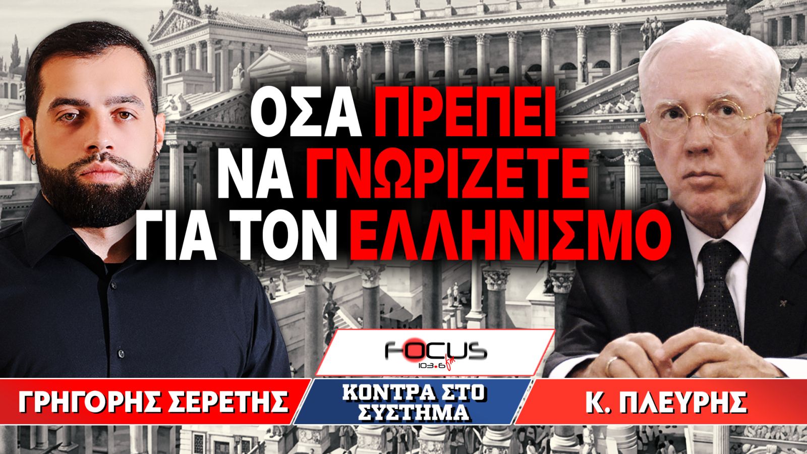 Στην εκπομπή του Γρηγόρη Σερέτη «Κόντρα στο Σύστημα» στον Focus FM 103,6 και ΜΑΧΗ FM 99,8 – τα μόνα πατριωτικά ραδιόφωνα – βρέθηκε σήμερα καλεσμένος ο Κωνσταντίνος Πλεύρης, νομικός και συγγραφέας, και μίλησε για τον Ελληνισμό, την ιστορική του διάσταση και την, όπως υποστήριξε, συνειδητή υποβάθμισή του από το ίδιο το ελληνικό κράτος.
