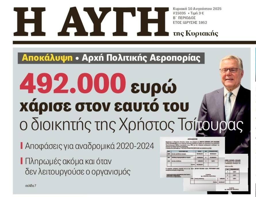 Σύμφωνα με τα έγγραφα που αποκαλύπτει η εφημερίδα, ο διοικητής της Αρχής Πολιτικής Αεροπορίας Χρήστος Τσίτουρας έχει υπογράψει μέσα σε έναν χρόνο τρεις αποφάσεις με τις οποίες δίνει στον εαυτό του συνολικά 492.000 ευρώ ως αναδρομική πληρωμή αποδοχών: