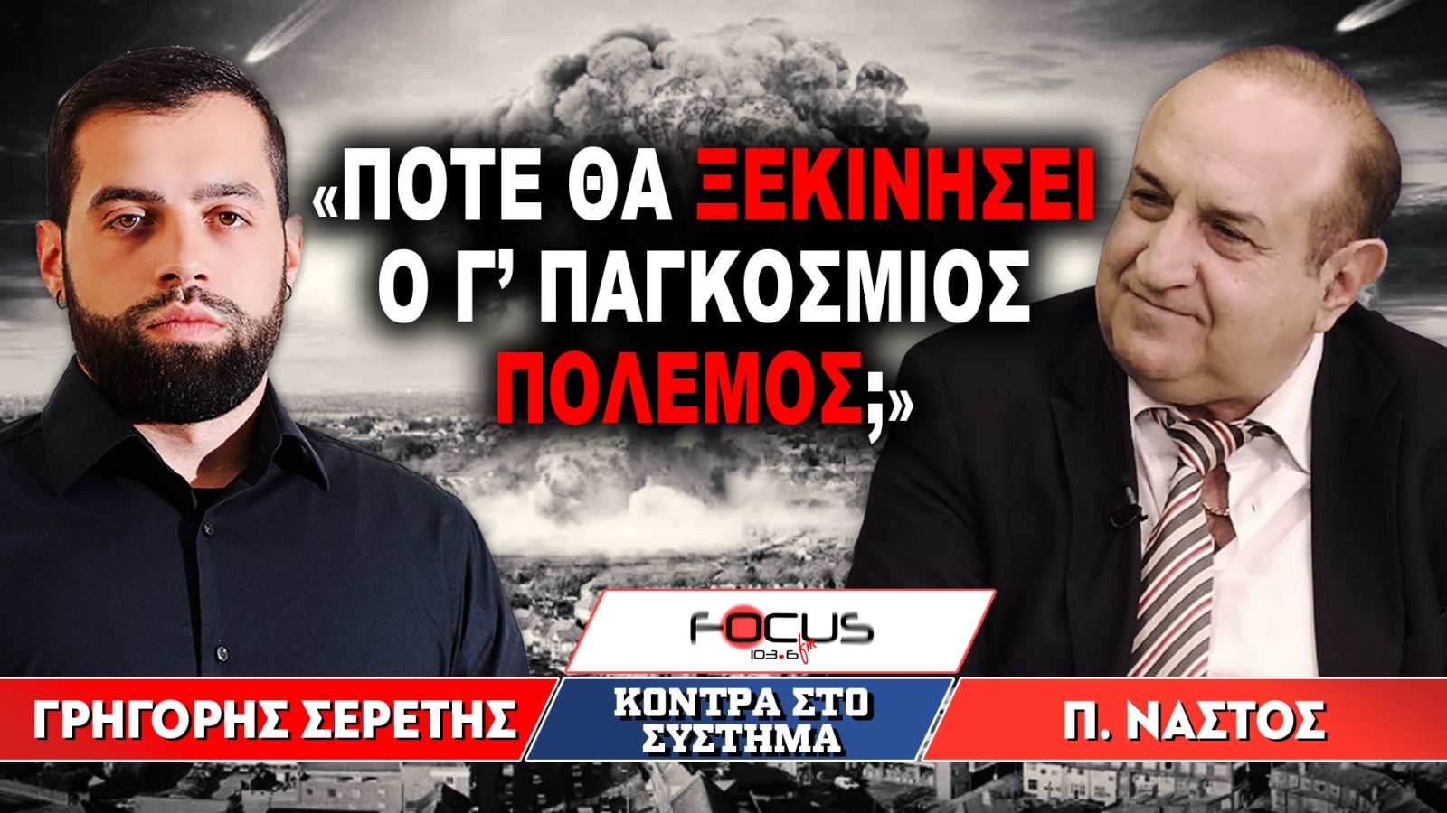 Στην εκπομπή του Γρηγόρη Σερέτη «Κόντρα στο Σύστημα» στον Focus FM 103,6 βρέθηκε σήμερα καλεσμένος ο Παναγιώτης Νάστος, απόστρατος αξιωματικός και αναλυτής γεωπολιτικών θεμάτων, και μίλησε για τον κίνδυνο ενός Γ΄ Παγκοσμίου Πολέμου, τα σενάρια επέκτασης της σύγκρουσης, τον ρόλο της Ελλάδας και την πραγματική θέση της Τουρκίας.
