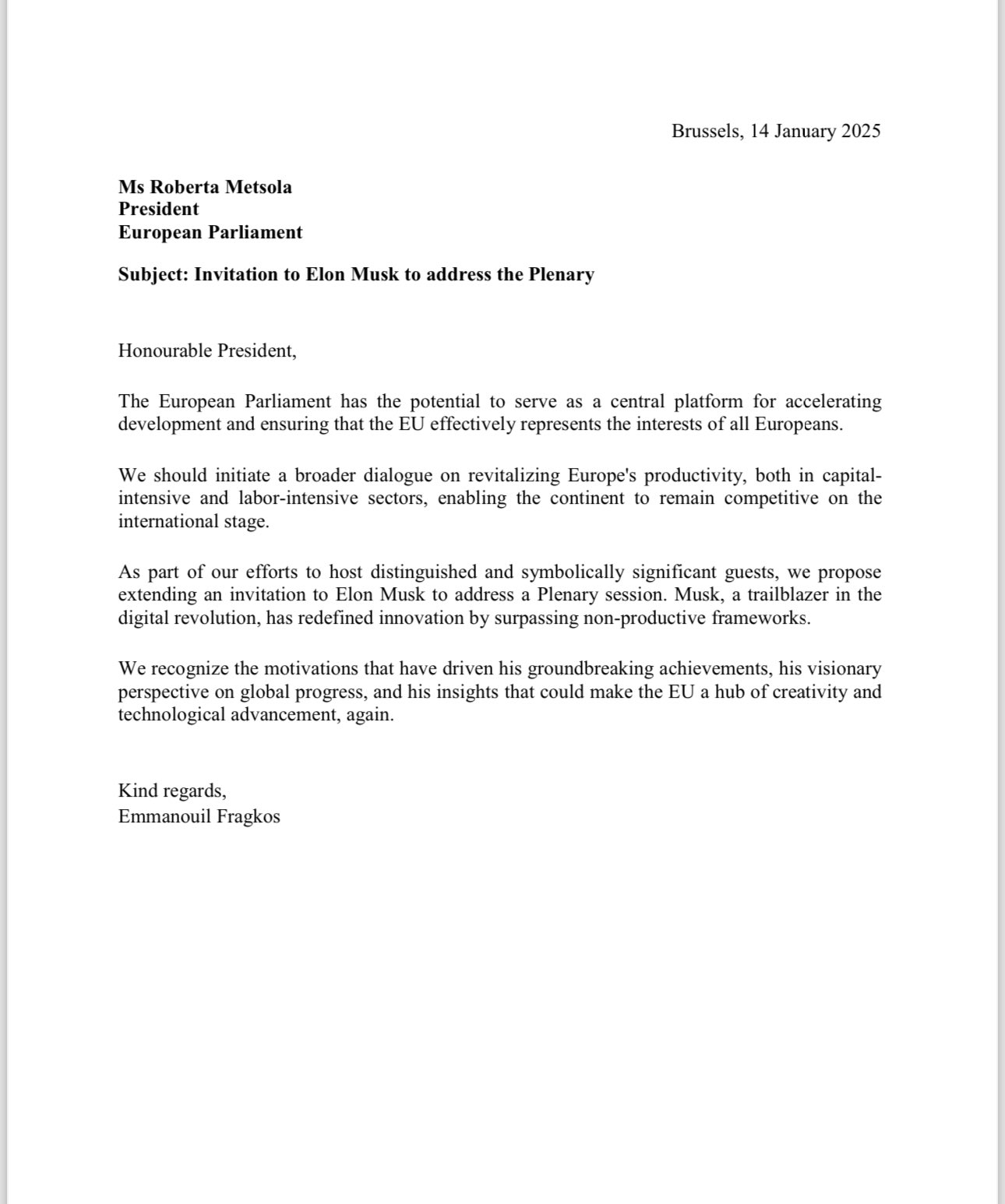 Η σχετική ανακοίνωση του κόμματος της Ελληνικής Λύσης αναφέρει: «Ο Ευρωβουλευτής της Ελληνικής Λύσης, Εμμανουήλ Φράγκος (Φραγκούλης), κατέθεσε πρόταση ενώπιον της Ολομέλειας του Ευρωπαϊκού Κοινοβουλίου, ώστε η πρόεδρός του Ρομπέρτα Μετσόλα, για να απευθύνει επίσημη πρόσκληση στον Ελον Μασκ, για να μιλήσει στην σε επερχόμενη συνεδρίαση του Σώματος στο Στρασβούργο».