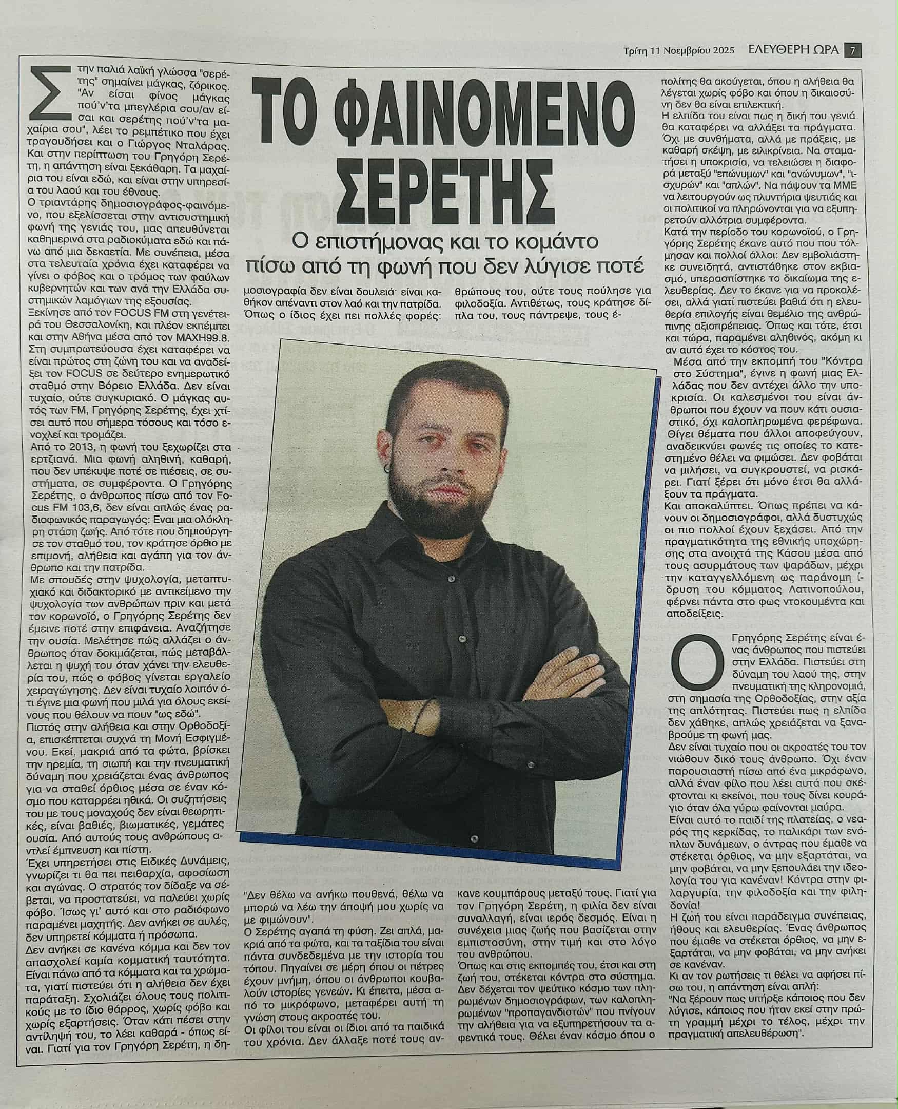 Αφιέρωμα στον Γρηγόρη Σερέτη, την ψυχή του Focus fm 103,6 και πρωταγωνιστή της εκπομπής “Κόντρα στο Σύστημα” είχε η εφημερίδα «Ελεύθερη Ώρα».