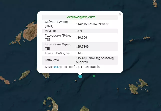 Σύμφωνα με το Γεωδυναμικό Ινστιτούτο, η δόνηση σημειώθηκε στις 06.39 το πρωί με εστιακό βάθος 14,4 χλμ. και επίκεντρο 15 χλμ. νότια νοτιοδυτικά της Αρκεσίνης Αμοργού.