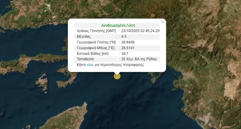 Σεισμός 4,5 Ρίχτερ ανοιχτά της Ρόδου